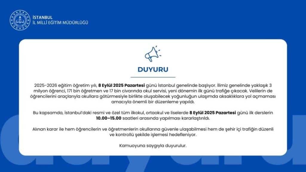 8 EYLÜL PAZARTESİ GÜNÜ OKUL DERS GİRİŞ-ÇIKIŞ SAATLERİ